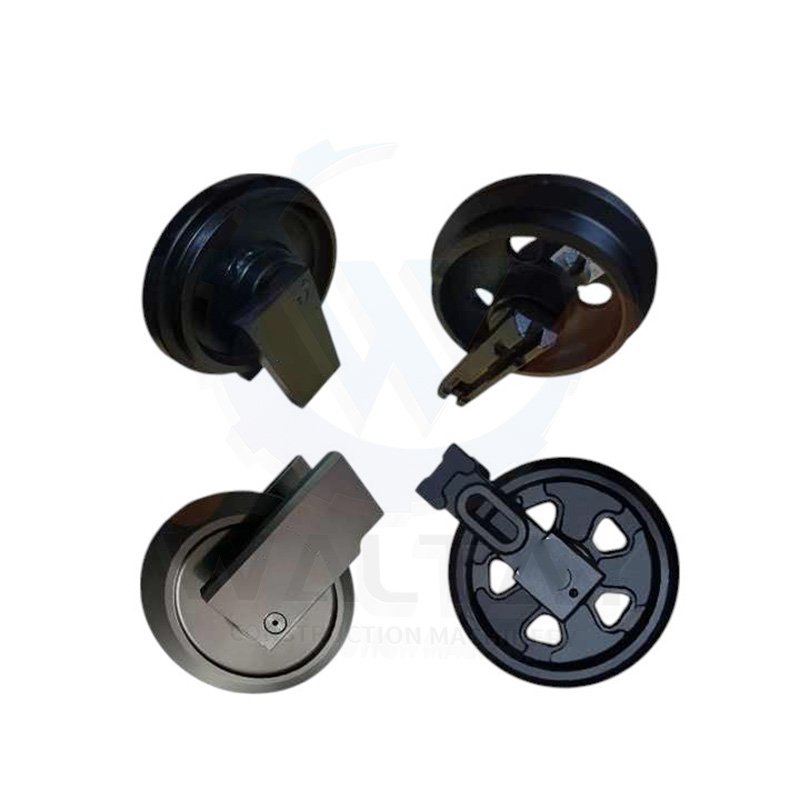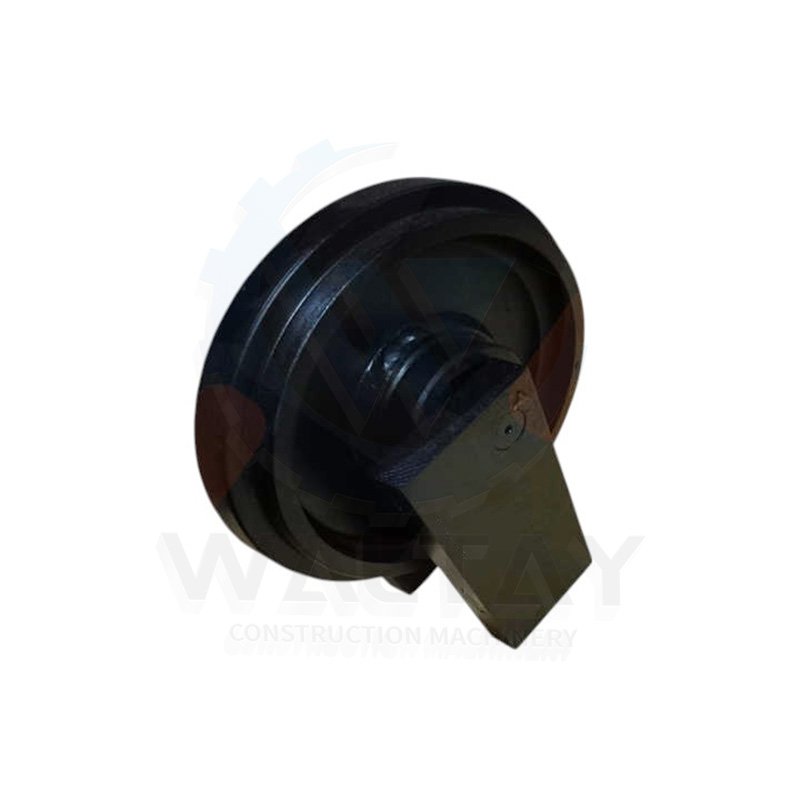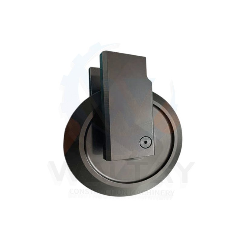 Track idler that guides the track chain and maintains its tension. A key undercarriage component for proper track alignment and prevention of derailment.